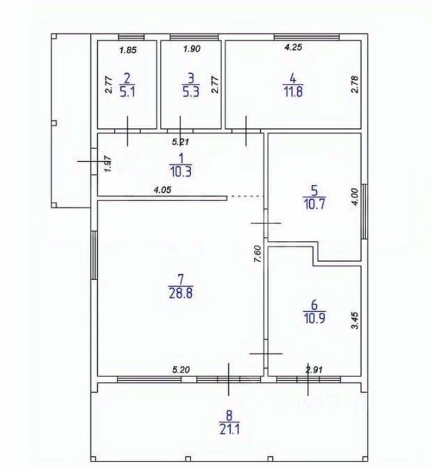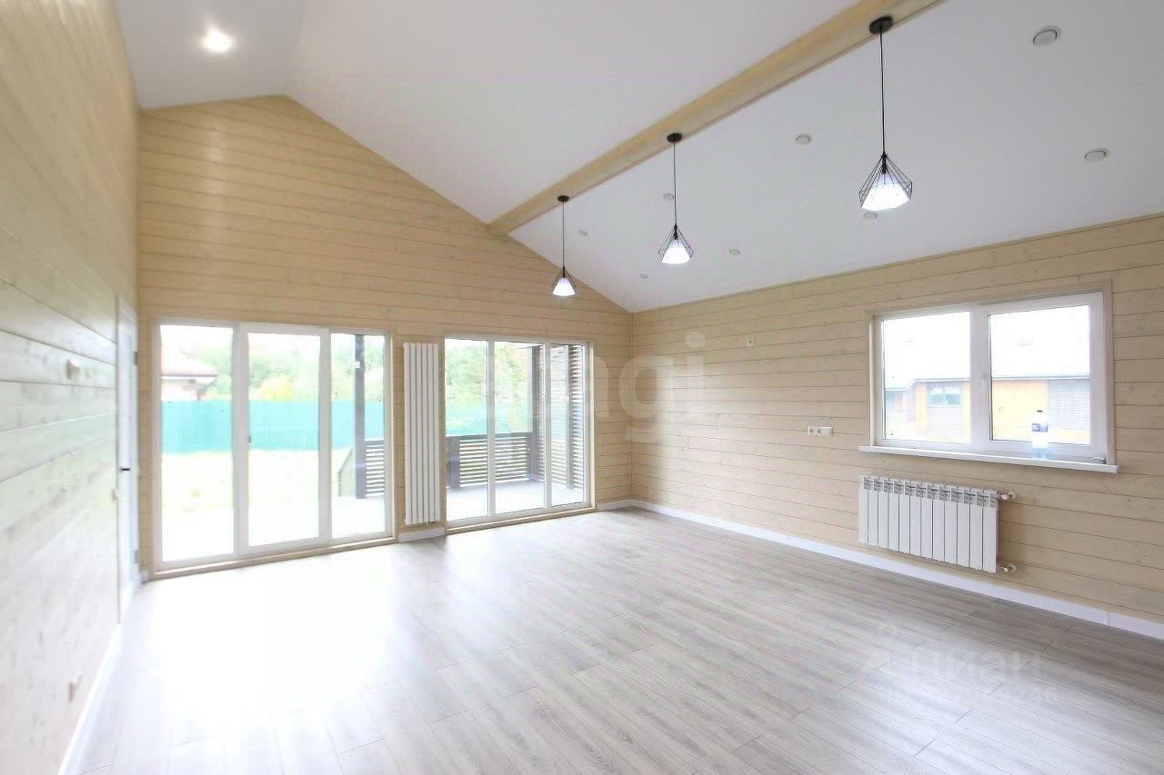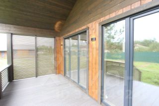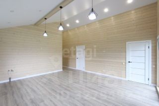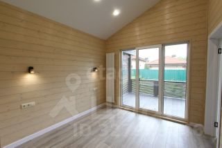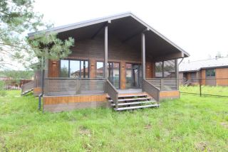 Планировка функциональная: прихожая, техническое помещение, ванная комната, три жилые комнаты и просторная кухня-гостиная с выходом на летнюю террасу. Внутренняя отделка включает имитацию бруса на стенах, ламинат в жилых зонах, ПВХ-плитку в санузле, натяжные потолки.