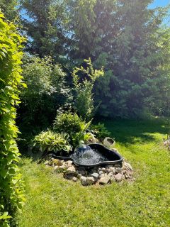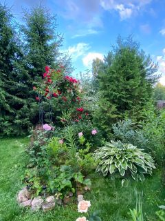 Яблони, Туи, Розы, Декоративные сосны, засеян газон.