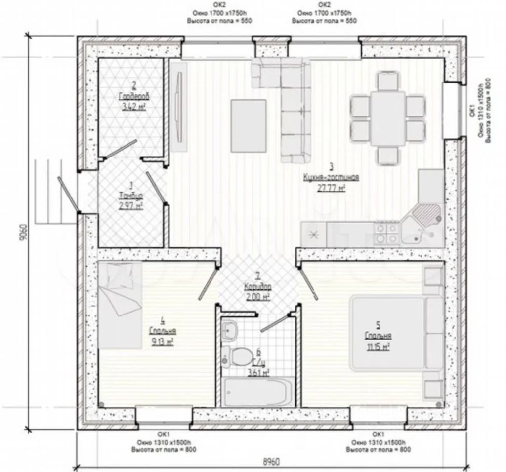 Высота потолков 5 м, панорамные окна, большая кухня-гостиная 27,8 м, две спальни, гардеробная.