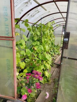 Ухоженный участок 12 сот, размежован на 2 участка. На участке ухоженный газон, большая теплица, красивые грядки, цветы, виноград, ели, плодовые деревья, кустарники.