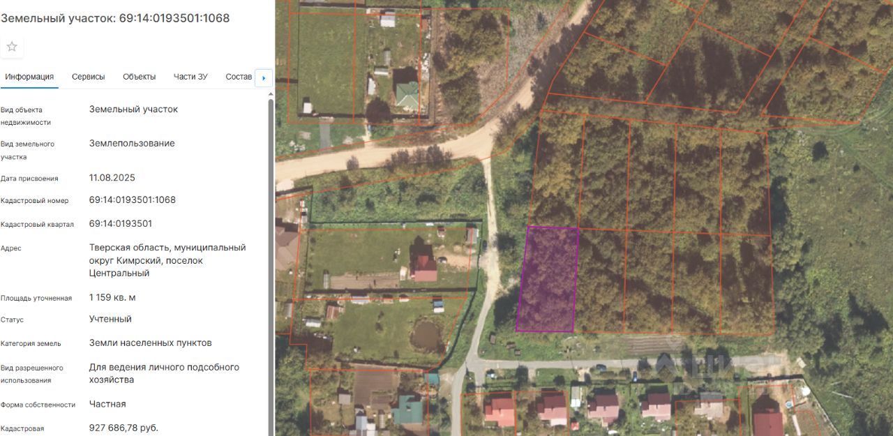 Земельный участок в черте города Кимры. Общая площадь один гектар. Размежеван на 10 участков правильной формы. Расположен в тихом месте на краю города в обжитом спальном районе.