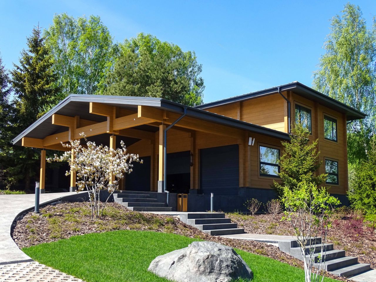 Отдельного внимания заслуживает гостевой домик, объединенный с гаражом, а также работа по ландшафтному дизайну. Площадь гостевого дома 224 кв.м.
