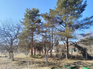 По периметру взрослые хвойные деревья.