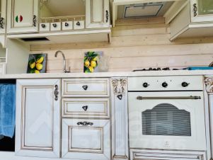 Кухня: натуральный дуб (Италия) с фасадами из муранского стекла, с элементами позолоты, кухня с европейской кухонной техникой.