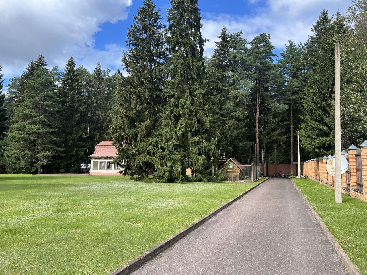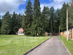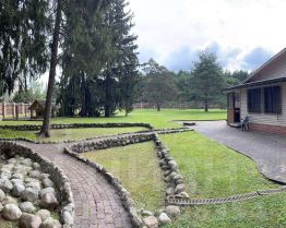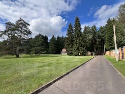 Большой,ухоженный земельный участок с элементами ландшафтного дизайна - каменное озеро с мостиками, газон, прогулочные дорожки из тротуарной плитки, огороженный теннисный корт, широкая асфальтированная дорога длиной в 100 м. для подъезда автомобилей к гаражу. Участок огорожен З м. деревянным забором на фундаменте с кирпичными столбами по периметру. Дополнительно с задней стороны основного участка имеется огороженный сеткой участок леса с маленьким прудом, местом для костра, дровником.