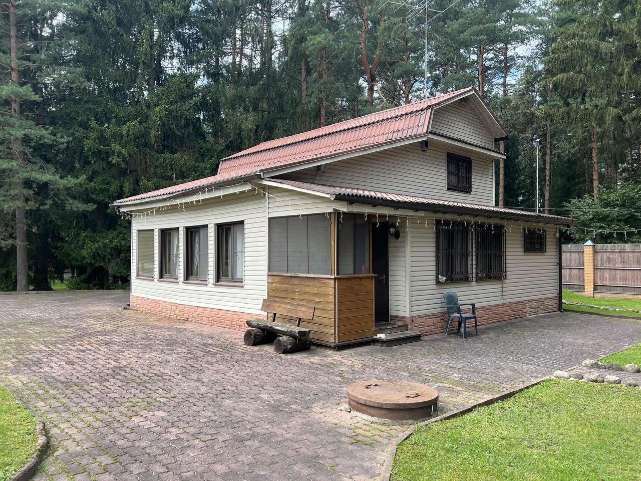 - Жилой 2-этажный деревянный дом, обшитый сайдингом, полностью меблированный мебелью из сосны, в котором расположена водоочистительная система, ванная, туалет, 3 спальни, встроенная кухня, гостиная и прихожая. На всех окнах установлены встроенные внешние жалюзи.