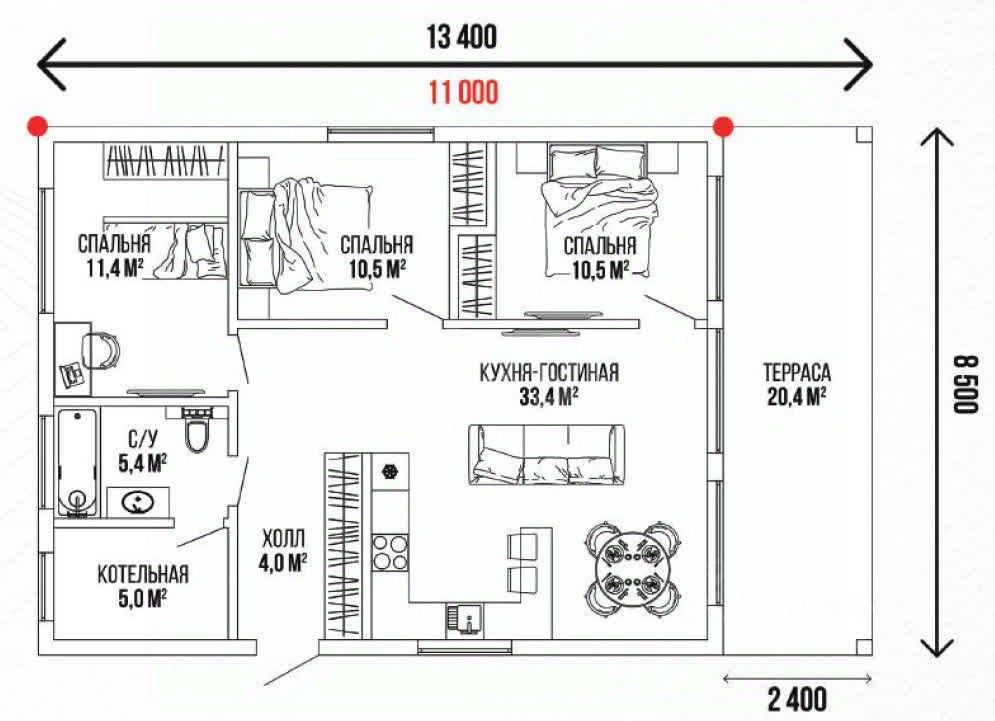 • Сердце дома — кухня-гостиная (33,4 м²). Здесь достаточно места для больших семейных ужинов, дружеских посиделок и праздников. Это место, где создается тепло вашего очага.