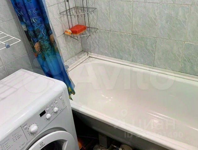 В ванной подвесной шкаф со встроенной раковиной, зеркальный шкаф с подсветкой, стиральная машина Samsung. Установлен водонагреватель, полотенцесушитель.