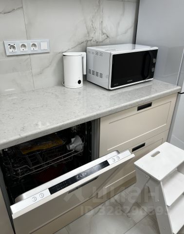 На кухне столешница и остров выполнены из кварцевого камня, врезная мойка из нержавеющей стали японской торговой марки Omoikiri. Смеситель для кухни Lemark с гибким изливом и функцией душа. Кухонная бытовая техника бренда Weissgauff (вытяжка, электрическая плита, электрический духовой шкаф, посудомоечная машина 600 мм). электрический чайник, микроволновая печь. Высота рабочей поверхности 920 мм.