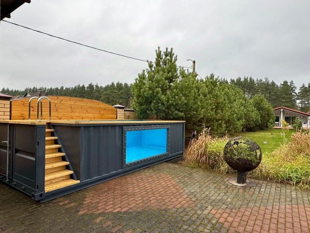 В отдельном здании тёплый каркасный бассейн, размер 4*7, душевая + санузел, тёплый пол. Оплата 700 рублей за 2часа за одного гостя.
