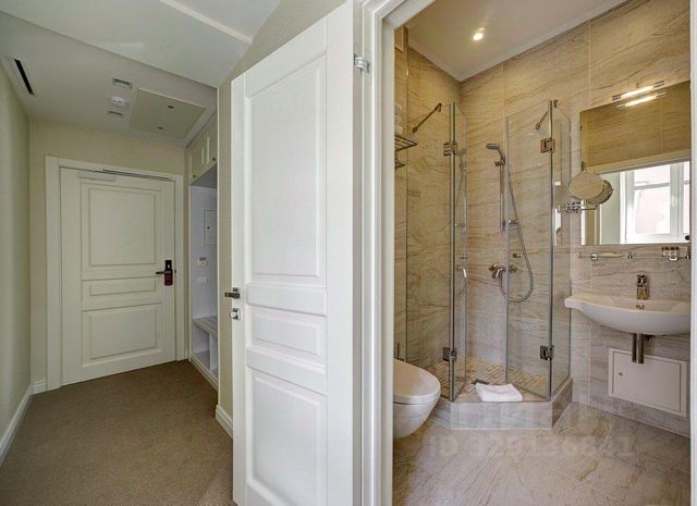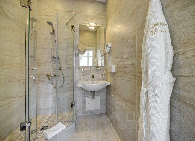 В санузле: душевая кабина с ванной, раковина, унитаз, набор туалетных принадлежностей, халаты, полотенца.